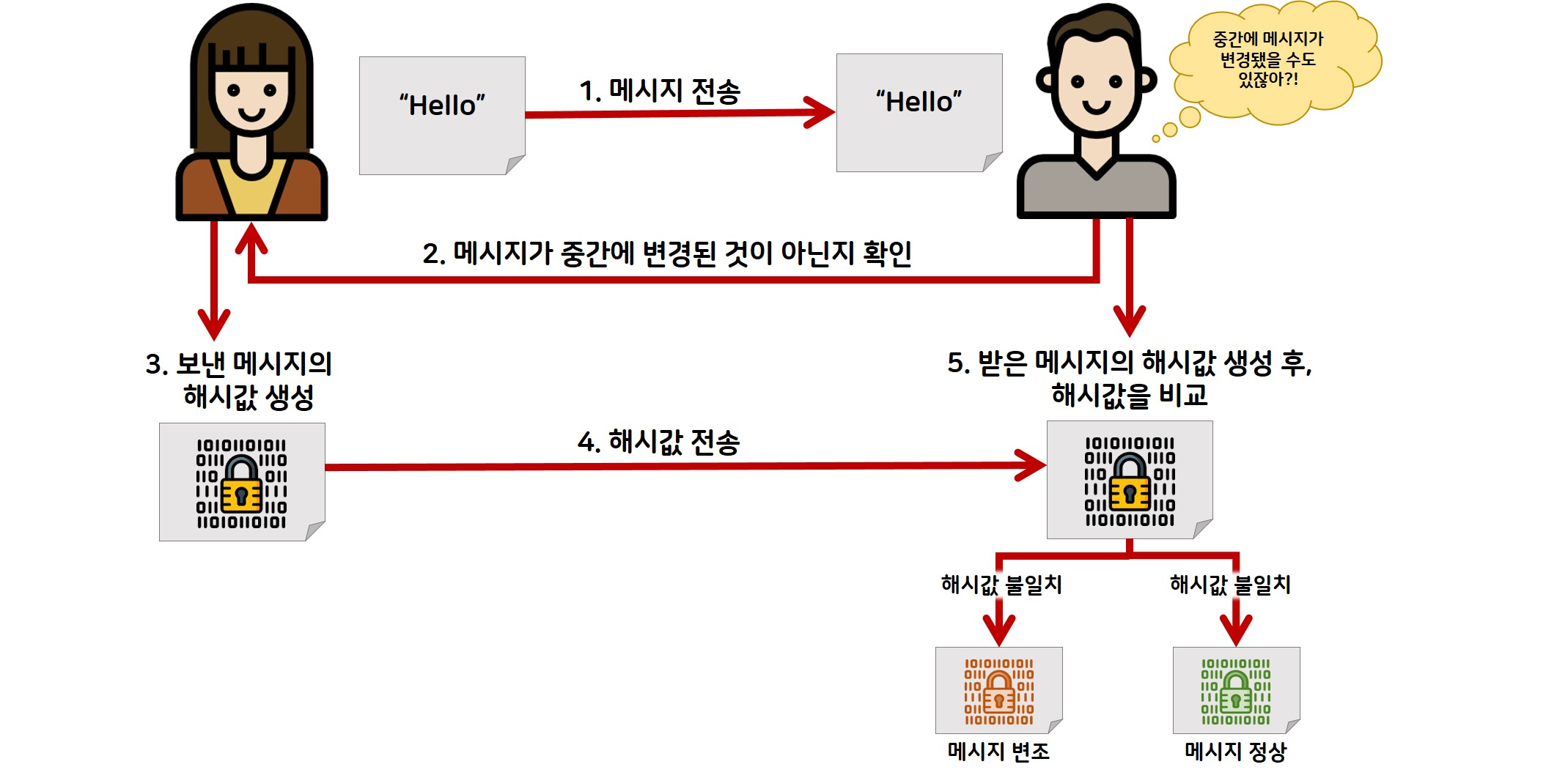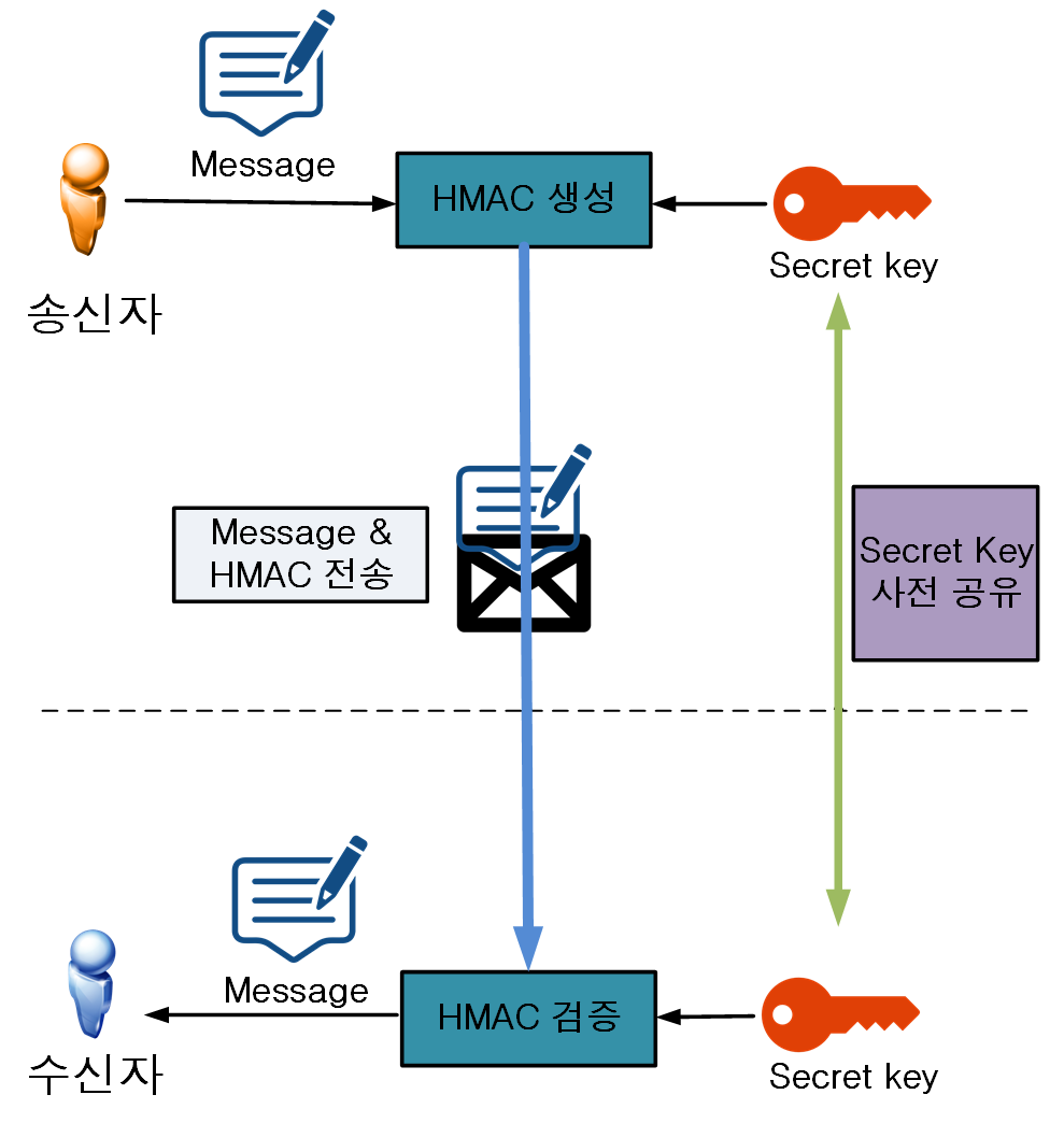 • 공유키를 이용하여 전달할 메시지의 해시값을 양쪽에서 생성하여, 메시지의 위변조 여부를 판단