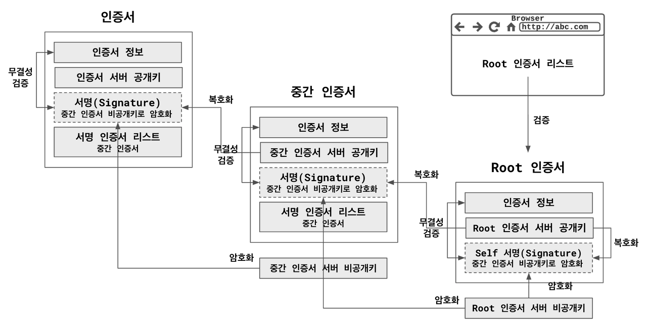• 인증서 체인: 인증서를 신뢰할 수 있도록 서명으로 만들어진 체인